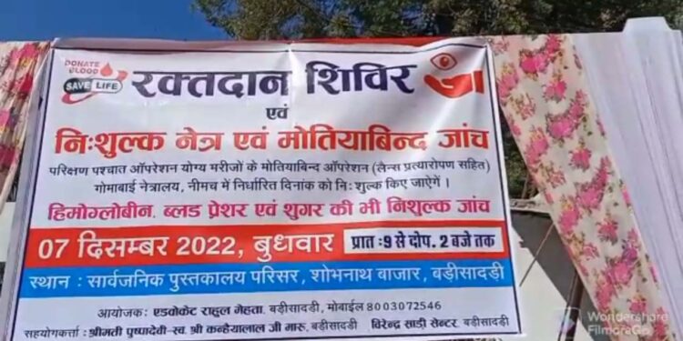 बड़ीसादड़ी में आयोजित रक्तदान एवं नैत्र जांच शिविर में 71युनिट रक्तदान हुआ व 141 नैत्र जांच की गई जिसमें 35 मोतियाबिंद के मरीजों को आपरेशन की सलाह दी गई