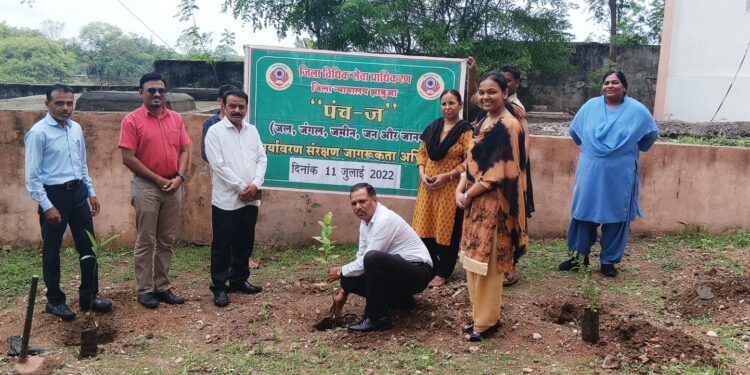 झाबुआ 11 जुलाई 2022 मध्यप्रदेश राज्य विधिक सेवा प्राधिकरण जबलपुर के निर्देशानुसार दिनांक 11 जुलाई से 25 जुलाई तक ”पंच-ज“ अभियान अंतर्गत प्रदेशव्यापी वृहद पौधारोपण अभियान आयोजित किया जाना है। इस अभियान की शुरूआत आज दिनांक 11 जुलाई को जिला विधिक सेवा प्राधिकरण झाबुआ के तत्वाधान में माननीय प्रधान जिला एवं सत्र न्यायाधीश श्रीमान मोहम्मद सैय्यदुल अबरार जी के मार्गदर्शन एवं जिला विधिक सेवा प्राधिकरण झाबुआ के सचिव एवं जिला न्यायाधीश श्रीमान लीलाधर सोलंकी जी की अध्यक्षता एवं प्रधान न्यायाधीश किशोर न्यायबोर्ड झाबुआ सुश्री साक्षी मसीह की उपस्थिति में वन स्टॉप सेंटर एवं बाल सम्प्रेक्षण गृह परिसर झाबुआ में पौधारोपण कार्यक्रम का आयोजन किया गया।