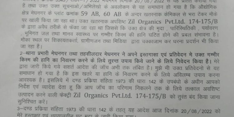 मेघनगर मे अपशिष्ट केमिकल पदार्थ को खुले में छोड़े पाए जाने पर औद्योगिक क्षेत्र मेघनगर की कंपनी जिल ऑर्गेनिक प्राइवेट लिमिटेड के मालिक सुकतु पिता सोमतीलाल शाह निवासी अहमदाबाद के विरुद्ध भारतीय दंड संहिता की धारा 277 तथा 284 के तहत थाना मेघनगर में प्रकरण पंजीबद्ध किया गया साथ ही दंड प्रक्रिया संहिता की धारा 133 तथा 142 के तहद केमिकल फैक्ट्री जिल ऑर्गेनिक्स प्राइवेट लिमिटेड को सील किया गया।