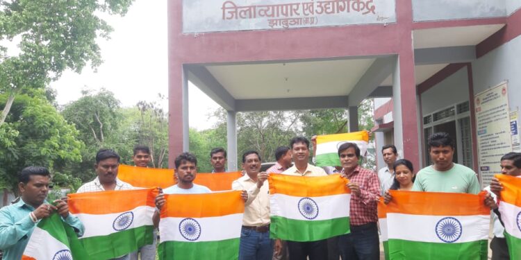 झाबुआ 12 अगस्त 2022 जिला व्यापार एवं उद्योग केन्द्र,झाबुआ द्वारा स्वरोजगार उद्यमियों के घर-घर तिरंगा अभियान के तहत राष्ट्रीय ध्वज वितरण कार्यक्रम का आयोजन किया गया। जिसमें लगभग 50 स्वरोजगारीयों को तिरंगों का निःशुल्क वितरण किया गया। कार्यक्रम आयोजन से पूर्व सभी उद्यमियों को महाप्रबंधक महोद्य द्वारा राष्ट्रीय ध्वज का महत्व देशवासीयों में राष्ट्रीय ध्वज के प्रति हमारे कर्तव्यों के बारे में अवगत कराते हुवे सभी उद्यमियों को अपने घर पर राष्ट्रीय ध्वज फहराने हेतु प्रेरित किया। राष्ट्रीय ध्वज वितरण कार्यक्रम का आयोजन जिला व्यापार एवं उद्योग केन्द्र, झाबुआ के महाप्रबंधक विरेन्द्रसिंह इस्क्या, एवं समस्त कर्मचारियों व उद्यमियों की उपस्थिति में किया गया।