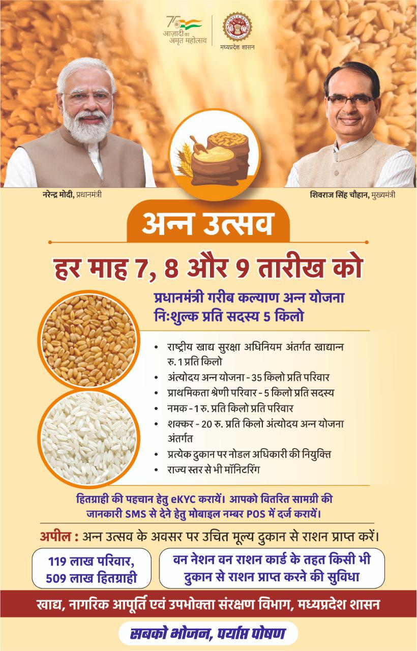 झाबुआ कलेक्टर सोमेश मिश्रा के आदेशानुसार प्रमुख सचिव, खाद्य, नागरीक आपूर्ति एवं उपभोक्ता संरक्षण विभाग, मंत्रालय भोपाल के परिपत्र अनुसार माननीय मुख्यमंत्री जी के निर्देश अनुसार झाबुआ जिले में अन्य उत्सव निर्धारित तिथि 7, 8 एवं 9 सितम्बर 2022 को प्रत्येक उतिच मूल्य दुकान पर आयोजित किया जाना है। जिसमें अधिक से अधिक उपभोक्ताओं को राशन वितरण किया जाना है इस हेतु विभिन्न विभागों के अधिकारियों को दायित्व सौपे गये है।