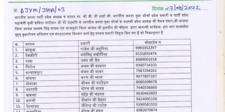 झाबुआ जिले के लिए हरा भरा मध्य प्रदेश वृहद वृक्ष्यारोपण के तहत प्रभारी नियक्त किये गये है। जी की भारतीय जनता पार्टी प्रदेश अध्यक्ष श्री वी डी शर्मा को, युवा मोर्चा प्रदेश महामंत्री सुश्री कविता पाटीदार की सहमति से भारतीय जनता युवा मोर्चा के प्रदेश अध्यक्ष श्री वैभव पवार जी व जिला अध्यक्ष कुलदीप सिंह चौहान द्वारा आगामी कार्यक्रम को देखते हुए एवं संगठनात्मक विस्तार कार्य हेतु मंडल प्रभारी नियुक्त किए गए है। इसकी जानकारी जिला सह मीडिया प्रभारी चंद्रशेखर राठौर ने दी है। इसकी सूचना भारतीय जनता युवा मोर्चा के जिला कार्यालय मंत्री के लेटर पेड़ से की गई है।