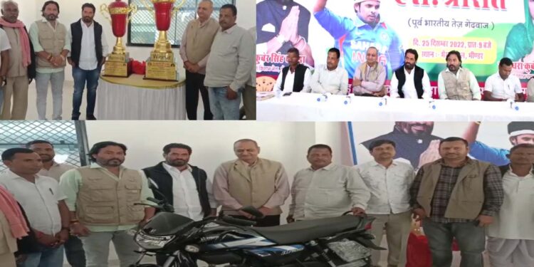 उदयपुर जिले के भींडर में स्वतंत्रता सेनानी स्व.गुलाब सिंह शक्तावत व स्व. माता दान सिंह चावड़ा की स्मृति में आयोजित तृतीय प्रधान क्रिकेट कप का आयोजन 25 दिसंबर से भैरव राजकीय उच्च माध्यमिक विद्यालय खेल मैदान भींडर में आयोजन होगा। इसको लेकर आयोजक व पूर्व प्रधान प्रतिनिधि कुबेर सिंह चावड़ा ने प्रेस वार्ता का आयोजन प्रधान कॉम्प्लेक्स में किया गया चावड़ा ने पत्रकारों को संबोधित करते हुए कहा कि पहले भी दो प्रधान क्रिकेट कप करवाये जा चुके है तृतीय प्रधान कप रविवार से शुरु होगा जिसका शुभारंभ भारतीय क्रिकेट टीम के पूर्व तेज गेंदबाज श्रीसंथ करेंगे। प्रतियोगिता में विधानसभा क्षेत्र की विभिन्न ग्राम पंचायतों सहित भींडर व कानोड़ नगर पालिका की 110 टीमें प्रतियोगिता में भाग लेगी विजेता टीम को 31000 रुपये तथा विजेता टीम को उप विजेता टीम को 15000 रुपये दिए जायेगे। मैन ऑफ द सीरीज में हीरो की मोटरसाइकिल दी जाएगी। टी-शर्ट व ट्रॉफी मोटरसाइकिल का अनावरण किया गया। चावड़ा ने कहा कि मेरा उद्देश्य इस टूर्नामेंट का करवाने का है क्षेत्र का खिलाड़ी भारतीय टीम में खेले ये ही मेरा उद्देश्य है साथ ही क्षेत्र के खिलाड़ियों की पहचान हो सके। प्रेस वार्ता के दौरान वरिष्ठ कांग्रेस नेता पूर्व पालिका अध्यक्ष देवेंद्र सिंह निवर्तमान कांग्रेस ब्लॉक वल्लभनगर अध्यक्ष सुनील कुकड़ा, पूर्व मनोनीत पार्षद लोकेंद्र सिंह चावड़ा पूर्व पार्षद व कांग्रेस नेता नारायण व्यास, शिवनारायण गुर्जर केदारिया सरपंच रामलाल शर्मा आदि उपस्थित रहे।