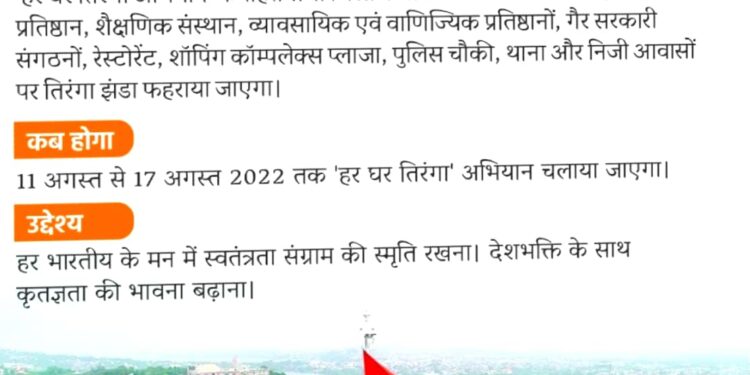 झाबुआ 07 जुलाई 2022 मध्यप्रदेश शासन संस्कृति विभाग मंत्रायल भोपाल के पत्र अनुसार ‘‘हर घर तिरंगा‘‘ अभियान का क्रियावयन किया जाना है। भारत सरकार द्वारा 11 से 17 अगस्त 2022 कि अवधि में ‘‘हर घर तिरंगा‘‘ अभियान के क्रियावयन हेतु निर्देश दिये गये है इस अभियान का मुख्य उद्देश्य देशवासियों को अपने घर पर राष्ट्रीय ध्वज लगाने के लिए प्रेरित करना, जन सामान्य में देशभक्ति की भावना को जागृत करना तथा राष्ट्रीय ध्वज के बारे में जागरूकता उत्पन्न करना है।
