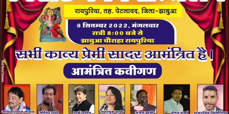 रायपुरिया मे बप्पा मित्र मंडल के द्वारा गणपति महोत्सव के चलते कई तरह के आयोजन किये जा रहे हैं उसी के तहत आज दिनांक 6 सितम्बर की श्याम को 8 बजे से झाबुआ चोराहा पर विराट कवि सम्मेलन का आयोजन किया जा रहा है। जिसमे सभी काव्य प्रेमी जानता सदर आमंत्रित है। ताकि इस कार्यक्रम को ओर बेतर बनाया जा सके।